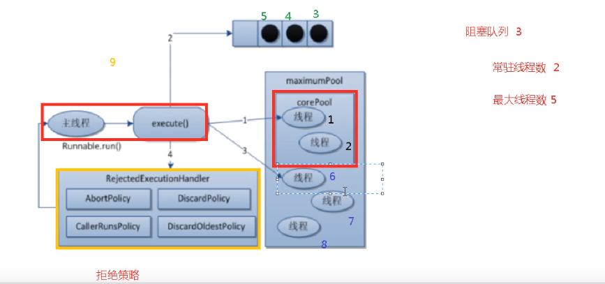 4、当创建了3个线程后,达到了最大支持线程数量,此时提交任务9,就会触发拒绝策略。