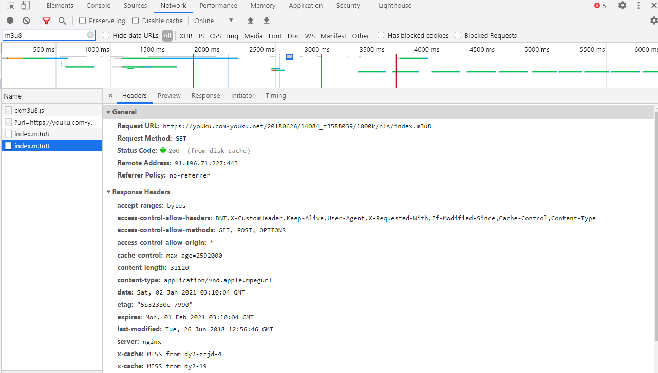 F12进入开发者模式,找到m3u8后缀的文件,可以看到有两个,把第一个m3u8文件下载下来以后发现,其内容是第二个m3u8的地址,第二个m3u8的url才是真实的地址