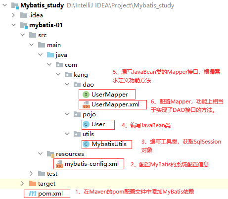 2.1 基本步骤 Maven项目中使用MyBatis的大致步骤,和常用的文件目录结构如图: