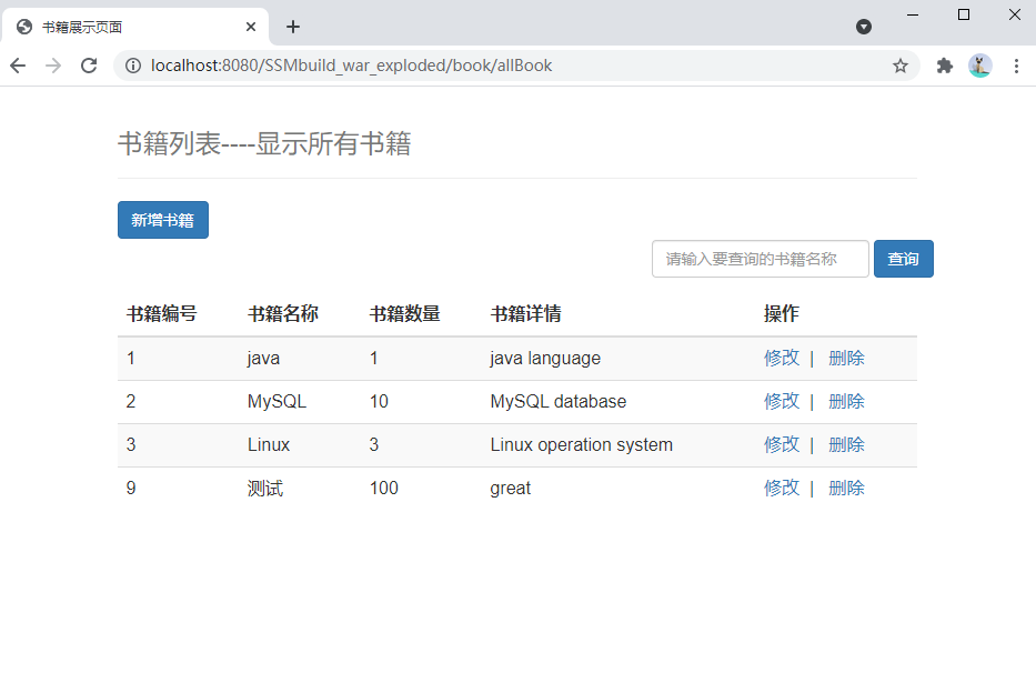 1 2 3 4 5 6 7 <div class ="form-inline" > <form action="${pageContext.request.contextPath}/book/searchBookByName" method="post" style="float: right" > <input type="text" name="queryBookName" class ="form-control" placeholder="请输入要查询的书籍名称" > <input type="submit" value="查询" class ="btn btn-primary" > </form> </div>