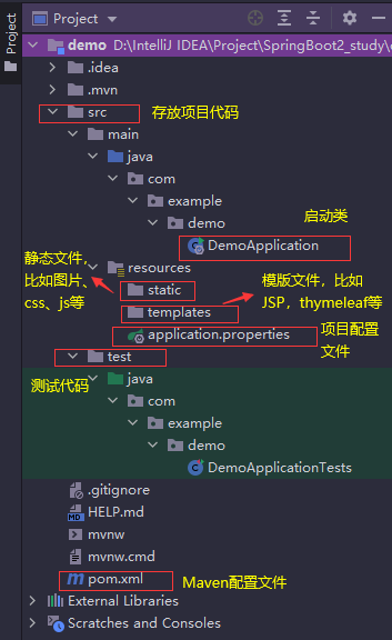 其中templates文件存放JSP页面、thymeleaf模版等;static文件夹存放图片、css文件、js文件、欢迎页、网站图标等静态资源。