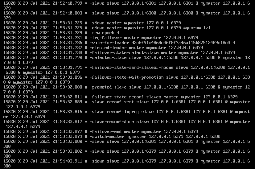 手动将主机shutdown掉,哨兵检测到主机宕机,会投票选出新的主机节点: