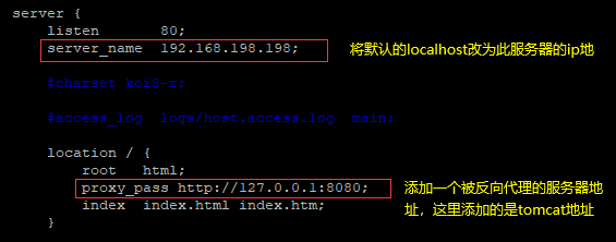 在Nginx的配置文件nginx.conf中,在http块的server块中,将主机名改为主机ip地址,然后在location块中,添加请求转发的地址: