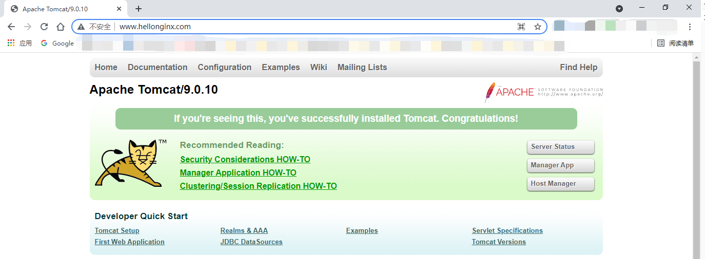 实现效果:在浏览器中访问www.hellonginx.com,跳转到Linux系统tomcat主页面中。
