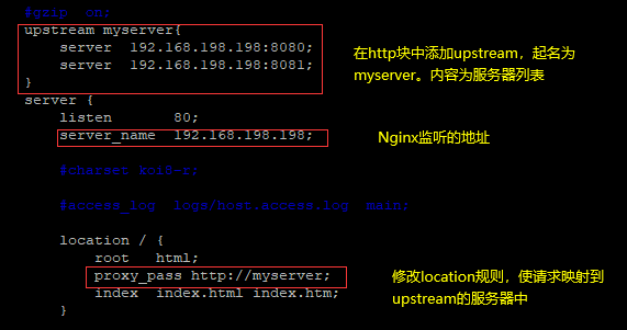 upstream,命名为myserver,然后列出服务器的列表。 - 在server块中的